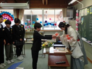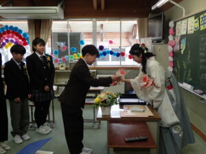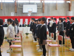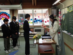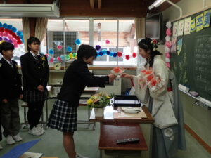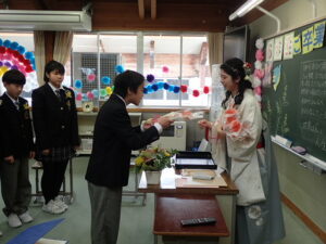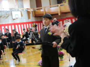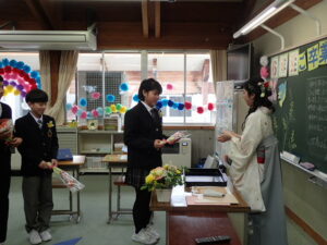 澄み切った青空のもと、 第31回卒業証書授与式が行われました。吉﨑校長先生から、7名の卒業生に卒業証書が授与されました。校長の式辞では「責任をもつこと」「相談と対話を大切にすること」「挑戦すること」の3つを卒業生に話されました。続いて、入善町教育委員会 事務局長 田中良一様 、PTA会長 坂東剛様から祝辞を賜りました。卒業生はもちろんのこと、在校生も凛とした態度で式に臨みました。全校でのお別れの言葉、全校合唱、校歌斉唱、子供たちのすべてを出し切った素晴らしい式でした。