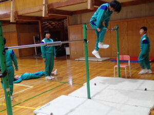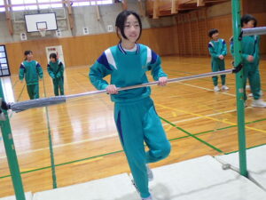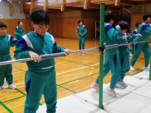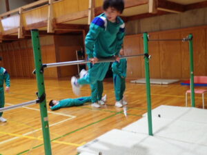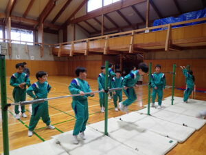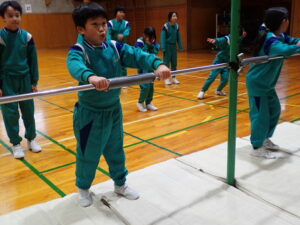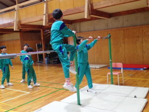 4・5・6年生の体育は鉄棒運動です。まず初めにバスケットボールのシュート練習で準備運動。そして鉄棒。上学年ともなると、逆上がりや連続前回りなどをしている子供が多く、成長を感じます。何度も繰り返し挑戦して練習に取り組んでいます。