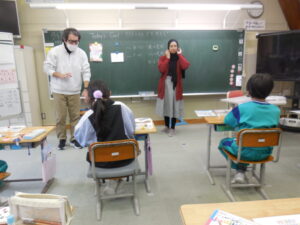 4年生の算数の時間。分数の大きさを比べる学習です。帯分数と仮分数の大きさを説明しています。進んで黒板に出てきて説明する子供たちに感心します。川上先生もうまく引き出し、他の子供たちに投げかけ納得できるように支援する姿が素敵です。友達に分かってもらうように、3人が説明力、大事です。