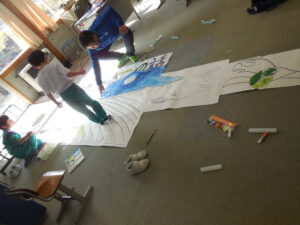 3・4年生の図画工作の時間です。「カッター名人になろう」でしたが、もうすっかり名人級です。色画用紙をカッターで切って、お城や家を製作中です。家の中に窓やカーテンを作って貼り、ドールハウスのようにしている子や、クリスマスモードのお城にしている子など、自由な発想で形を作って楽しんでいます。