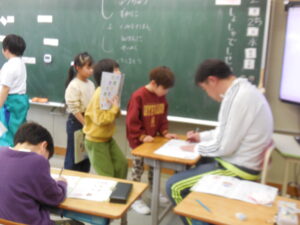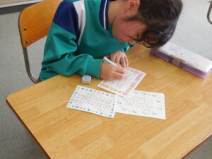 静かです。集中しています。書写ノートの文字も丁寧です。後藤先生に見てもらう時はドキドキ?しっかり見てもらい、ちゃんと直し、書字を学んでいます。「し」静かに「よ」よく見て「し」集中して「や」約束を守る 「しょしゃ」の約束が毎時間生きています。