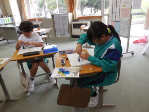 「先生、コンパスいつもらえるん?」と算数の時間に聞いていた3年生。ついにゲットしました。「ちょっと早いサンタさんからのプレゼントや!」なんてかわいい子供たち!慎重に持って、針のカバーを外しました。デジタル教科書の動画を見ながら、コンパスの使い方を学び、何度もノートに描く練習をしました。軸を持ってクルンと回すことに苦戦していましたが、徐々にコツをつかんで上手になっていきました。ちょっぴり危ない?でも楽しい道具をもらって、とてもうれしい3年生です。