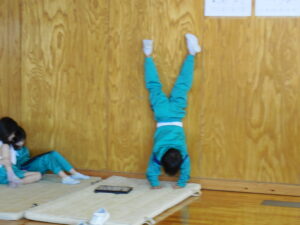 1・2年生は、30周年記念アトラクションでマット運動を披露しました。今日の体育は、クロムブックを使って友達同士で技を撮り合っています。たくさんの映像を見て自分の成長を感じています。タブレットの巧みな操作に感心します。側転を練習する3年生は「もうちょっと腰上げて」「ねえ、ちゃんと撮ってね」と言いながら何度も挑戦しています。かっこよく回転できるようになってきました。