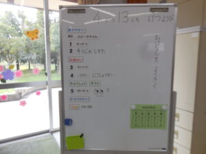 1年教室の環境がとてもよく整っています。担任の川上先生のきれいな文字で、1年生に分かりやすい短い言葉で約束が書かれています。また、予定黒板も、一日の見通しがもてるよう工夫されています。安心です。