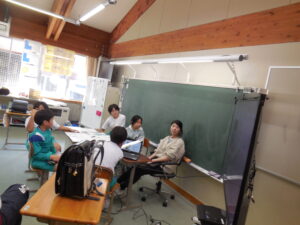 5・6年生の書写。静かな中で書いていました。指導する後藤先生と一緒に筆を持って練習し、こつをつかんでいました。画数の多いお題でしたが、なかなかの力作です。