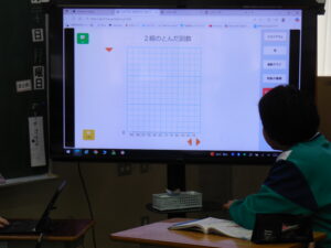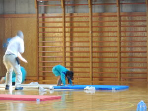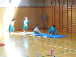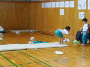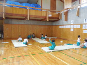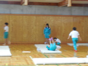 晴れていますが体育館でマット運動です。なんと、壁倒立に挑戦しています。かなりハイレベルですが、子供たちはがぜんやる気満々。友達と一生懸命練習に取り組みました。後片付けも仲良く素早く。給食当番が先に行ったのですが、最後までしっかりできました。