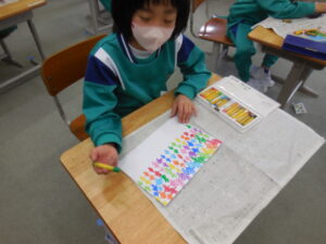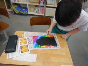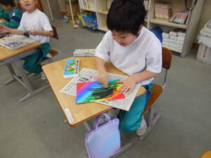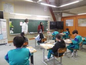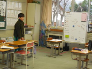 4年生、理科室で実験中です。「水の体積の変化を調べています」水を温めると体積はどうなるかを石原先生と一緒に実験しました。温めるとガラス管の中の水の水位が上がり、氷で冷やすと水位が下がっていきます。「見とって、見とって」とうれしそうに実験を見せてくれました。これでしっかり頭に入りましたね。
