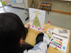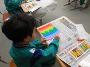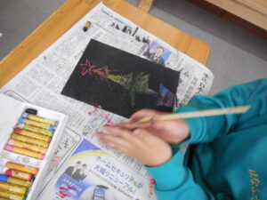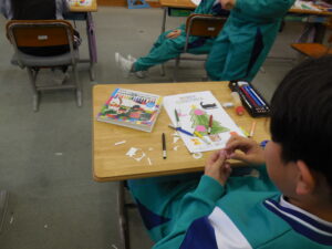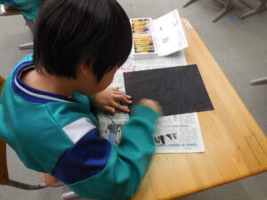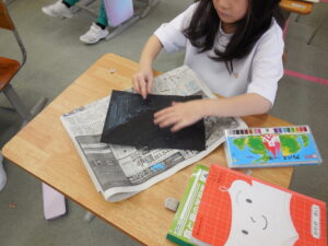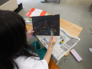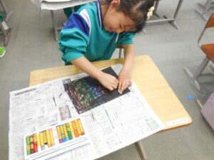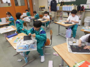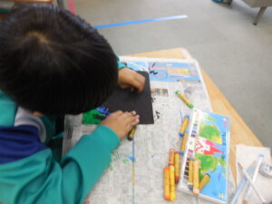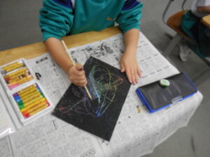 ウィーンウィーンと6年教室から音が聞こえてきます。見ると、子供たちが蓄電器を回しています。蓄電器でためた電気を電極をつないでいろいろ試していました。オルゴールや豆電球、発光ダイオードなど。オルゴールの音色が聞こえたり、豆電球が点灯したりしたら大喜び。自分で作った電気が使われていることを実感しました。