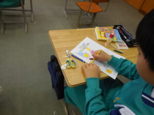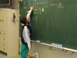 コンパスを使いこなすことができるようになった3年生。今度は球の学習です。色々なボールの直径をはかりました。教科書のはかり方を参考にしてペアで取り組みました。切らなくても、この方法なら直径がわかる!大きさの違う球(ボール)をたくさん調べ、はかり方に慣れていきました。