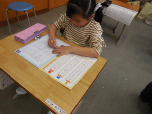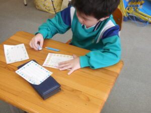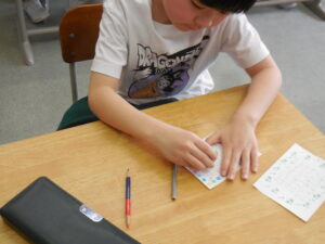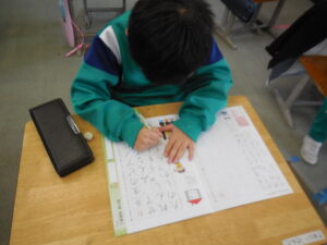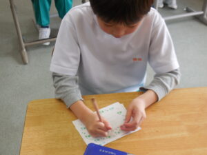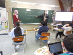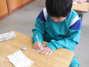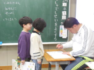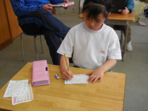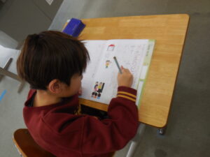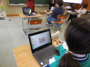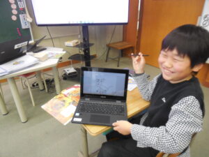 3・4年生の外国語活動の時間は、絵本を読みました。指導してくださる廣田先生に聞くと、何と自力で読んだそうです。そしてその内容について質問してタブレットに絵を描いて答える問題でした。質問をよく聞いてサルや犬等の動物のイラストを描いて盛り上がっていました。ナディア先生の発音をよく聞いて復唱したり答えたりすることがとても上手になりました。