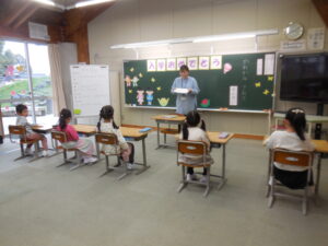 まずはじめに、新しく赴任された5名の方の新任式を行いました。新しく来られた方々に子供たちは興味津々、笑顔で挨拶を聞いていました。