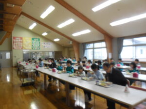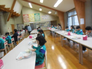 ランチルームでの給食がスタートしました。進級して、仕事がレベルアップしました。盛り付けや配膳を縦割り班で協力して上手に行っています。モリモリ食べてパワーアップしましょう。驚いたのは、とても静かに食事をしていることです。新年度、給食主任の坂藤先生が給食のシステムやマナーを丁寧に指導してくださったお陰です。気持ちよく食事ができます。明日からは1年生も給食が始まります!楽しみですね。