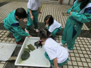 カメのグリーンが冬眠から目を覚ましました。理科室の水槽から、中庭の我が家?に戻ってきました。広い中庭で、全校の子供たちが毎日グリーンを見ることができます。とても人懐っこいかわいいカメです。