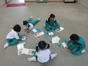 「小さな世界」の歌唱練習です。どのように歌うといいかなという先生の問いかけに進んで自分の考えを発表していました。そのあと、みんなで歌いました。よく知っているメロディで楽しそうでした。