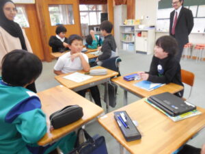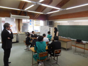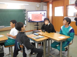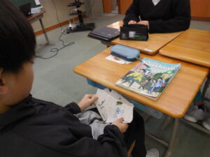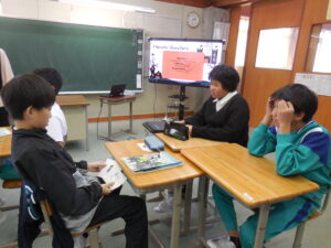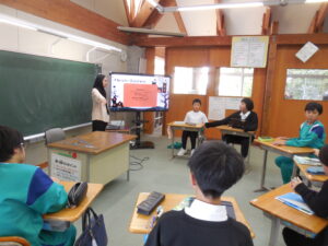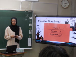ハロウィンです。6年生の外国語は、ハロウィンにちなんだ授業でした。ハロウィンに関するカードを当てるゲームをしました。一人が持っているカードに対する質問をして、その答えを聞きながら、カードに書かれているものを当てます。アイテムによってポイントが違いわくわくします。友達との受け答えがとても楽しそうです。