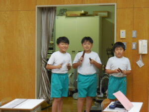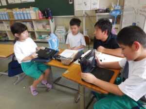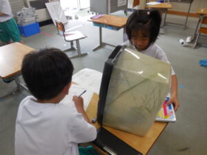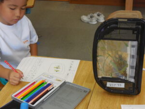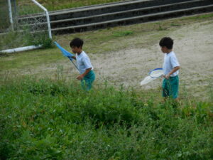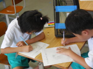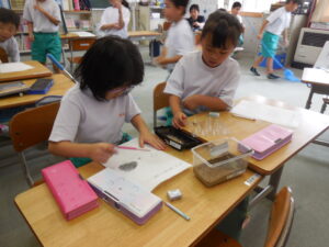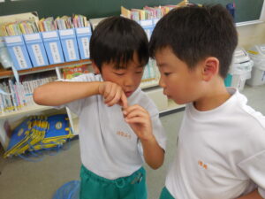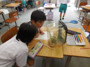 大きなトノサマバッタが何匹も虫かごに入っています。「グラウンドにいっぱいおるよ」「見て見て!」本当にでかいです。みんな夢中になって見入っています。ひばり野小学校、自然がいっぱい昆虫もいっぱいです。