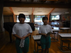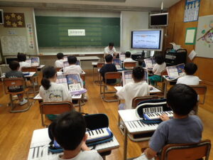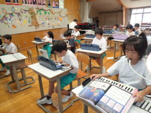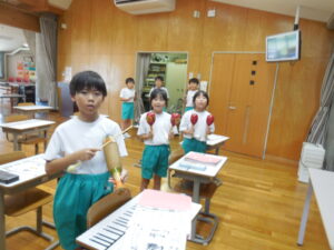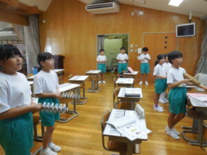 音楽室から軽快な楽器の音が聞こえてきます。♪いろんな木の実の曲に合わせて担当楽器を演奏して合奏していました。クラベス、ギロ、すずの3つの楽器の音色が楽しくノリノリで合わさっていました。子供たちの表情もとても楽しそうです。