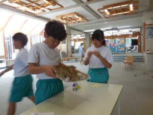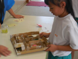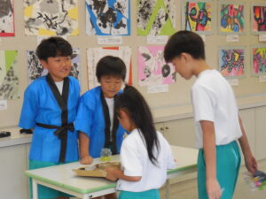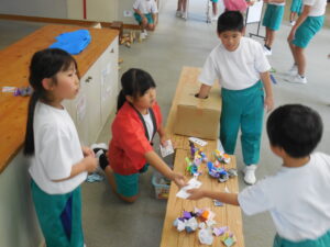 学級活動かと思ったら、国語の学習だそうです。学校のみんなを楽しませるイベントを考え、実行しました。以前から道具や景品を作り準備を進めてきました。今日は、大休憩に全校の友達に楽しんでもらいました。ボウリング、くじ引き、射的、迷路の4つのお店はどれも楽しさおもしろさ満載でした。みんな大喜びで行列に並んでいました。相手に対する受け答えもとても上手で素敵でした。まだまだやりたいという子がたくさんいました。大成功です!!