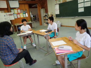 5年生の国語の時間。前回は「海と山、行くならどっち」という話題で話合いの学習をしていました。今回は「だからこっちでしょう」と「質問し合って、考えの違いを明確にする」「どちらの考えに説得力があるか考える」という課題でした。「猫」か「犬」どちらがいいか。担任の福澤先生も一緒に話合いに入って説得力勝負です。相手を説得させるべく、活発な話合いが続きました。