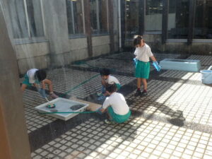 カメのグリーン、「お世話し隊」がしっかり掃除と餌やりをしていました。グリーンを持ち上げてきれいに水槽を掃除します。幸せなグリーン。お世話し隊ありがとう。