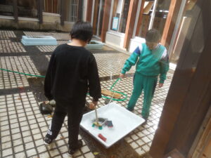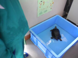 ひばり野小学校のアイドル?ミドリガメのグリーンが冬眠のため引っ越しをしました。今まで中庭でのびのびと過ごし、お世話し隊の子供たちが掃除や餌やりをしてきました。養護教諭の村中先生曰く、「餌を食べなくなってきたら、冬眠が近い」そうです。理科室の水槽に引っ越しました。子供たちがリレー式で、中庭から理科室へと運びました。しばらく、お休みなさい・・・。