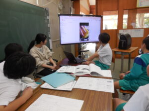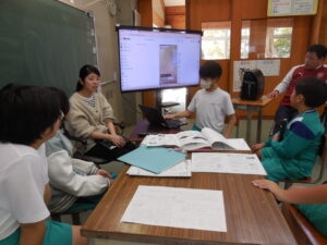 5・6年生の書写。静かな中で書いていました。指導する後藤先生と一緒に筆を持って練習し、こつをつかんでいました。画数の多いお題でしたが、なかなかの力作です。