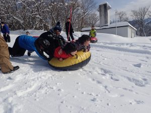 2日目は、かんじきハイクを行いました。だれも歩いていない新雪の上を進んだり、丘から転がったりして楽しみました。天気に恵まれたことで、山の上から眺める景色はまさに絶景でした。午後には、宿泊所近くの丘を利用してチューブそりも楽しみました。