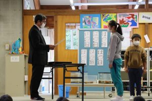 終業式の後に、河内先生、上田先生、亀田先生から『冬休みの生活「あ・い・う・え・お」』のお話がありました。新しい生活様式についての話や公共施設を使うときのマナーやルールについて確認をしました。また、メディアの使い方に関しては、自分の名前や住所を気軽に言わない、載せないなど、SNS等のマナーやルールを考えながら、正しい使い方を確認しました。