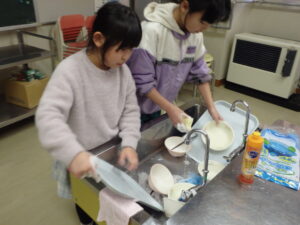「洗うの大変」「これを調理師さんは毎日40人分くらいやっているなんてすごい」と実感したようです。途中でお皿を落としてしまい「われなくてよかった」・・・。家でお手伝いをしている子供たちはなかなか上手でした!