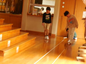 長い長さをはかる道具、巻き尺を使いました。2年生までは30cm物差しや1メートル物差しを使いました。今度は、子供たちの言葉で言うと、ばけつは「クルクルになっている」そうで、その周りをはかったり、ワークスペースなどの縦の長さをはかったりするときには物差しは足りないし・・・。巻き尺の仕組やはかり方をみんなで学習しました。玄関前の廊下や2階の渡り廊下をはかってみました。「ピンとして」「ちゃんと0合わせんなんよ」と言いながら、協力して測定しました。