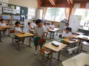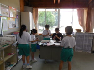 暑くなってきました。登校するなり、1年生が「昨日、海行ってきたよ」「ヒスイ海岸行ってきた。友達に会ったよ」もう夏モードです。そして、教室へ向かうと・・・「先生!カエルになっとる!見て!」と大騒ぎでした。3・4年生は「アゲハになった!!」と福澤先生が持ち帰っていた虫かごのなかのアゲハチョウに夢中でした。それは美しいチョウでした!朝から大発見。今週のスタートは最高です!