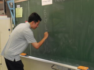 アルファベットのテストをしています。ジェイク先生が言ったアルファベットを指さして答えるというテストです。「簡単簡単」と言いながら指さしていましたが、「Z」や「v」など発音の難しいものは間違えやすいようです。しかし、みんな高得点でした。アルファベットはばっちり!