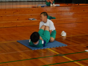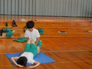 4~6年生は上体お越しです。ペアになって仲良く測定しました。立ち幅跳びも測定したようで「2メートル行った!」と話す子もいました。数字となって自分の成長が分かり、うれしそうです。