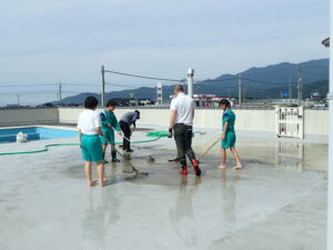 なんでも委員会は、プール掃除に向けてミニ掃除をしました。来週プール掃除をします。デッキブラシで床をごしごしきれいにしました。プール、近付いてきましたね。