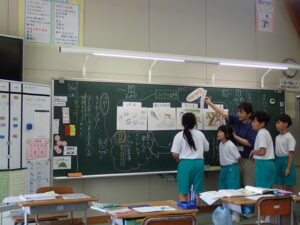 1・2年生が生活科で観察カードを書いていました。アサガオやミニトマト、オタマジャクシやダンゴムシ。「もしかして、トノサマガエルかもしれん」と大きなオタマジャクシも見せてくれました。自分の育てている生き物や植物を大事そうに見せてくれます。暑いのでくたっとしている葉っぱ。一生懸命水やりをしています。