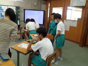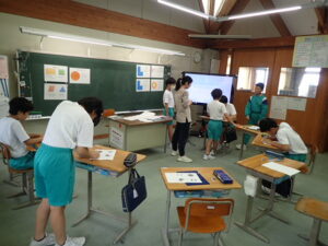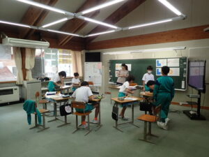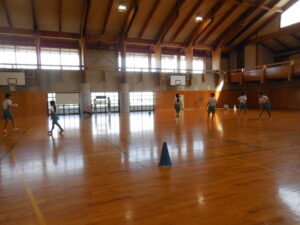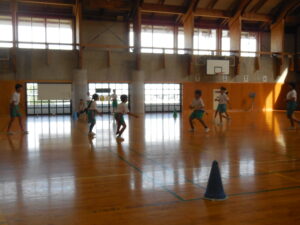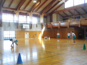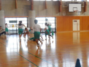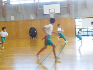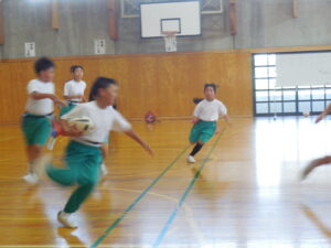 運動会が終わりました。上学年の体育はタグラグビーです。タグを取られないように相手をかわしてゴールを目指します。ラグビーボールなので、床に落ちると思わぬ方向に行ってしまいます。しかし、みんなパスをつないで上手に進んでいました。2回目にしてはみんなとても上手です。チームワークもばっちりです。