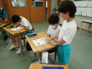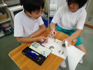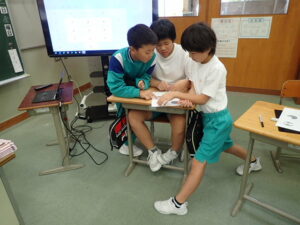 算数科の円の面積の学習。今日は丸い円だけではなく、複合図形の面積を求めました。色々なやり方があるのですが、友達に自分の方法を教えたりアドバイスしたりして、席を立ち歩きながら学び合っていました。友達との学び、自由に学び合える雰囲気が6年生のすばらしさです。うらやましい限りです。