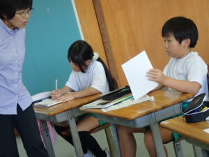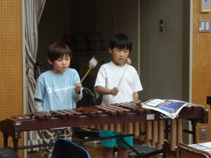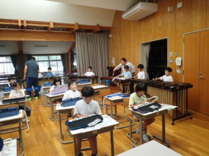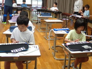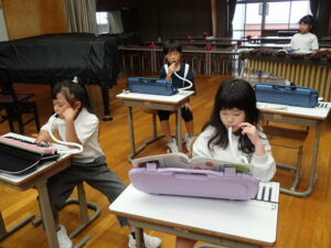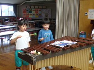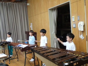 「きらきらぼし」の鍵盤ハーモニカをマスターした1・2年生。さらなるミッションは木琴でした!何としっかり正しい音で木琴を演奏しています。鍵盤とは違って吹かずに叩くのでやりやすいようです。鍵盤ハーモニカと木琴を合わせての合奏練習を何度も繰り返しました。