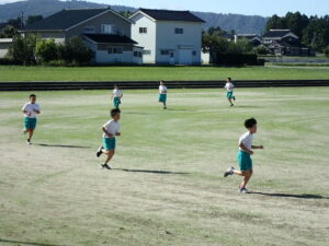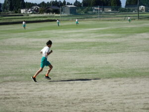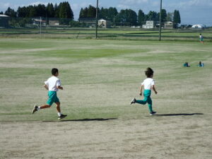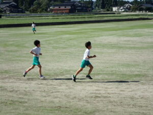 体育の時間、トラックを気持ちよさそうに(最初は)走る子供たち。持久走の練習です。「めざせ自己ベスト」カードには、自分の目標が書いてありました。トラック5周、がんばっています。