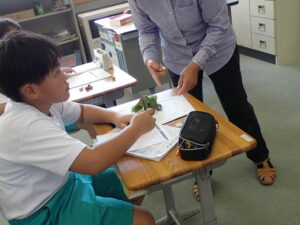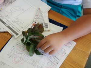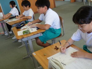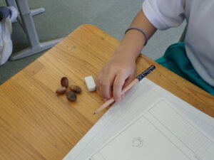 植物の観察カードを書いていました。学校の周りで見付けたお気に入りの植物です。どんぐりやユキツバキ、入善オトメキクザクラ、ハナミズキ・・・。春とは違った様子を感じながら丁寧に絵を描きました。