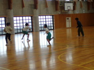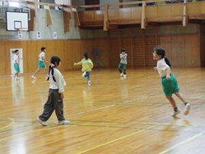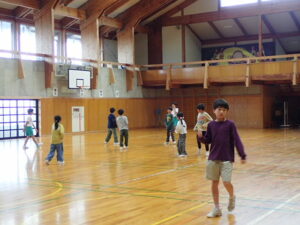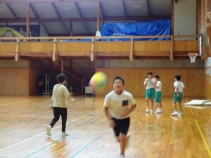 体育館では鬼ごっこやドッジボール。3~6年生が汗びっしょりになって走っていました。