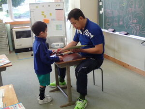 九九、2年教室でがんばりカードを手に覚えています。担任の先生、友達、他の先生方という欄があります。担任の後藤先生ににらまれつつ?挑戦していました。がんばれ~!