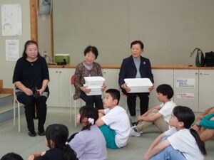 野中地区の手芸クラブの方から、お手玉をいただきました。手芸クラブの会員の、盛山さん、清水さん、南地さんの3名の方が来校され、子供たちに手渡してくださいました。お手玉で遊んだことが少ない子供たちなので、興味津々です。贈呈式が終わった後、みんなでお手玉を楽しみました。手作りのきれいなお手玉です。大事に使わせていただきます。手芸クラブの皆さん、ありがとうございました。