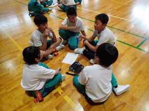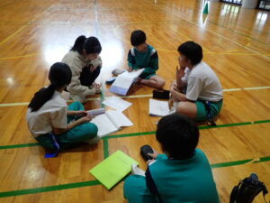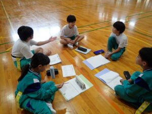 体育館に行くと、グループになって話合いをしていました。タグラグビーの作戦タイムです。守り方や攻め方の作戦を練っていました。話合いの途中でコートに行き、現場で確認するなど意欲的です。グループ全員の意識が高い証拠です。