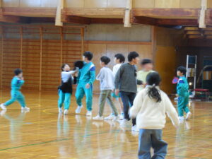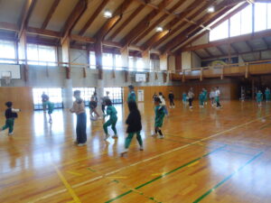 大休憩のチャレンジタイムはドッジビーです。やわらかいフリスビーを使っているので、当たってもいたくありません。しかし、どこへ飛んでいくか分からないので大変。思わぬところへ飛んできて当たったり、キャッチできなかったり・・・。楽しいですね。