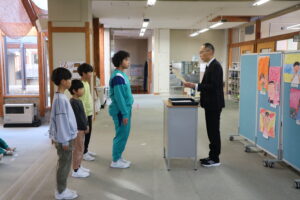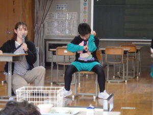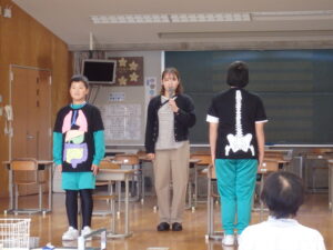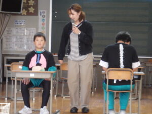 給食の時間、給食委員会の6年生と一緒に姿勢の大切さを話してくださいました。姿勢が悪いと内臓にも影響があるそうです。実にリアルです。