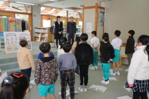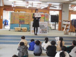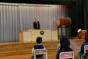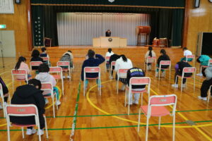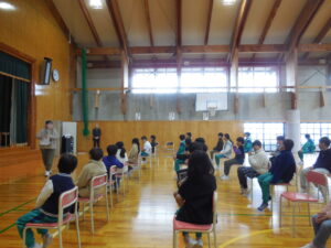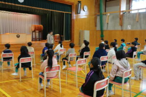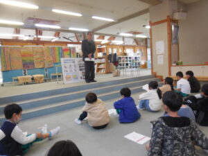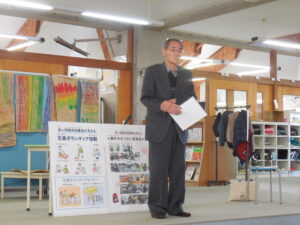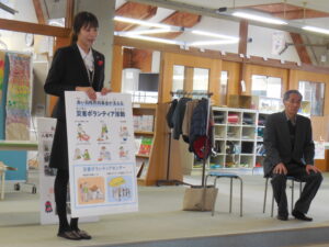 赤い羽根共同募金の「ありがとうメッセージ」紹介を行いました。入善町社会福祉協議会の桑守様と入善町手をつなぐ育成会の上田俊一様にご来校いただき、赤い羽根共同募金の仕組みや使われ方等について話を聞きました。入善町が住みやすい地域になるように使われたり、災害準備金への貯蓄や災害ボランティア活動資金として使われたりしていることを教えていただきました。上田様からは、育成会の様々な取組みを紹介していただき、地域と共に生活できる社会づくりについてお話していただきました。