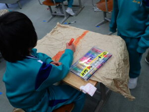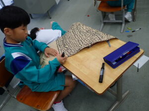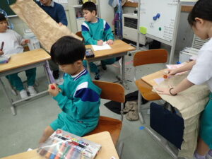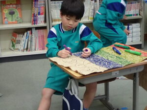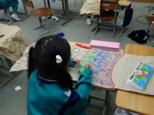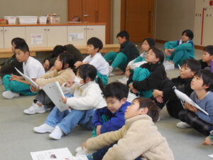 3・4年生の外国語は「クリスマスカードを作ろう」でした。しかし、実際に作るのは次回とのこと。今日は形や色の言い方の練習をしました。子供たちの好きなキャラクターを映し出し、廣田先生やナディア先生の発音をよく聞いて張り切って発言しました。