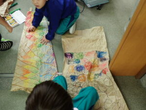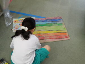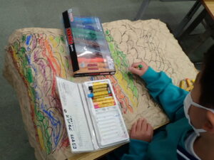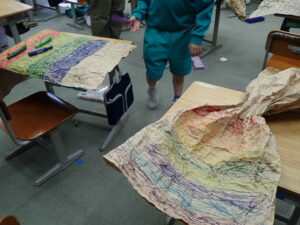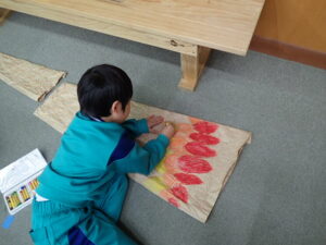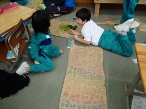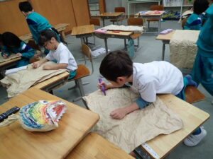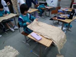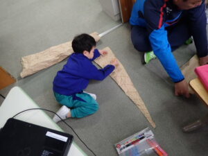 巨大な茶色の袋をくしゃくしゃにしています。ぎゅっとしたいものを作ります!さてさて何をぎゅっとしたいのかな・・・。