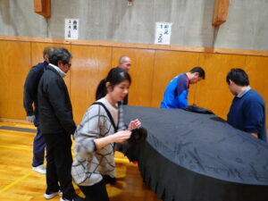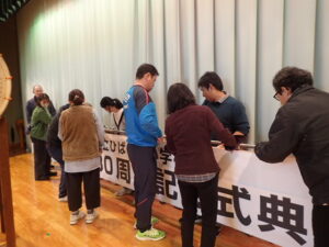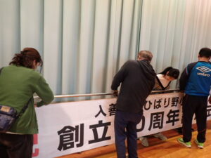 11月22日の記念式典・アトラクションまであと10日余りとなりました。日々、教職員のみんなは着々と準備を進めています。ステージの看板が出来上がり、実際に設置してみました。また、ピアノや発表用の太鼓などの場所確認をしました。一声かけるとみんなが集まって一気に作業できるチームひばり野です。団結力最高です!